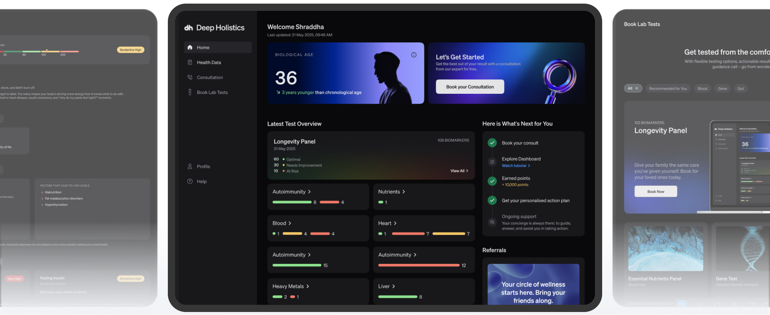 Deep Holistics is more than a blood test. Access an ecosystem of diagnostics, expert-led guidance, and wellness solutions personalized to you.