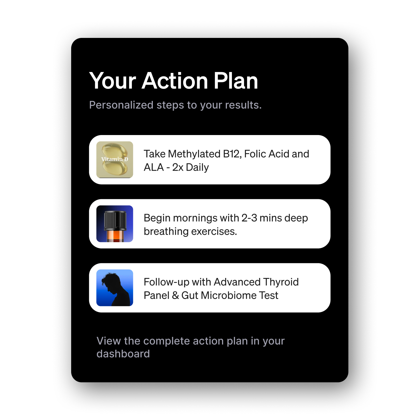 Turn your insights into action with expert guidance on supplements, exercise, nutrition, sleep, stress and follow-up testing, all tailored to helping you steadily improve your health.