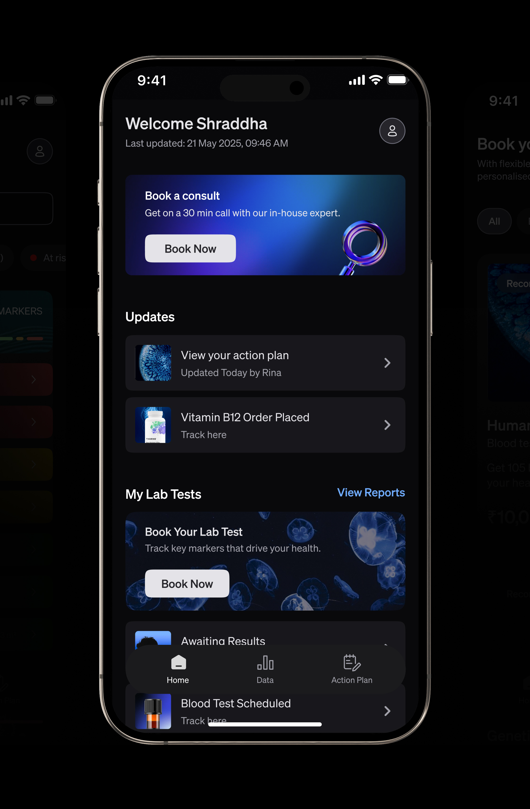 A system that connects it all. Your blood, your genetics, your gut, your habits, your goals — all in one place. Backed by data. Explained in your language. Made for action, not overwhelm.